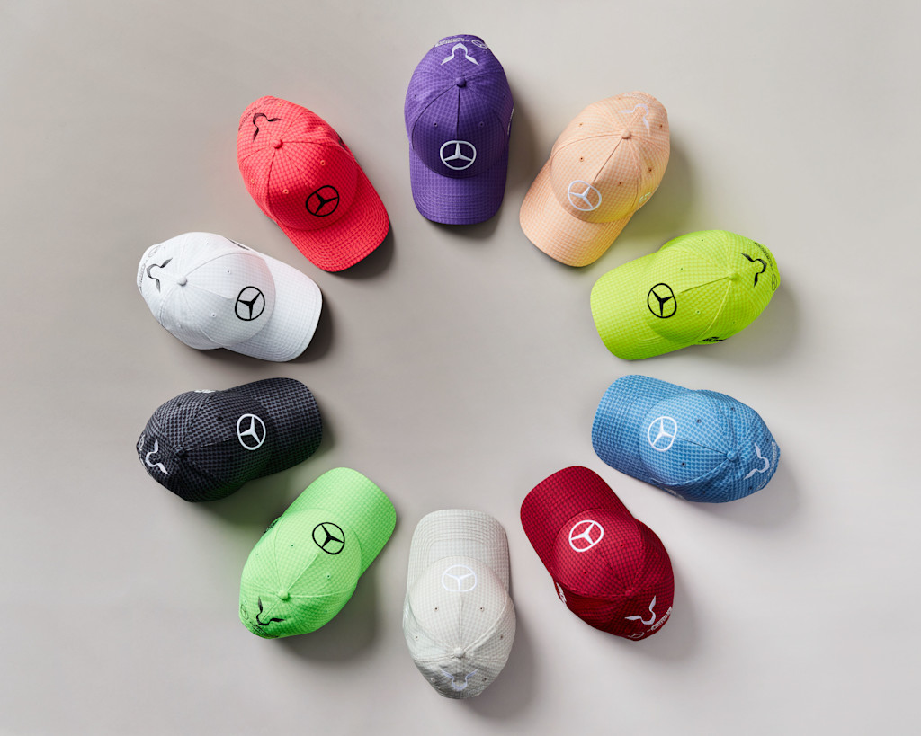 To celebrate a decade working together, Lewis created an epic 10-piece cap collection for the 2023 season, each with their own striking colour. But all sharing the same shape, logos and pattern.