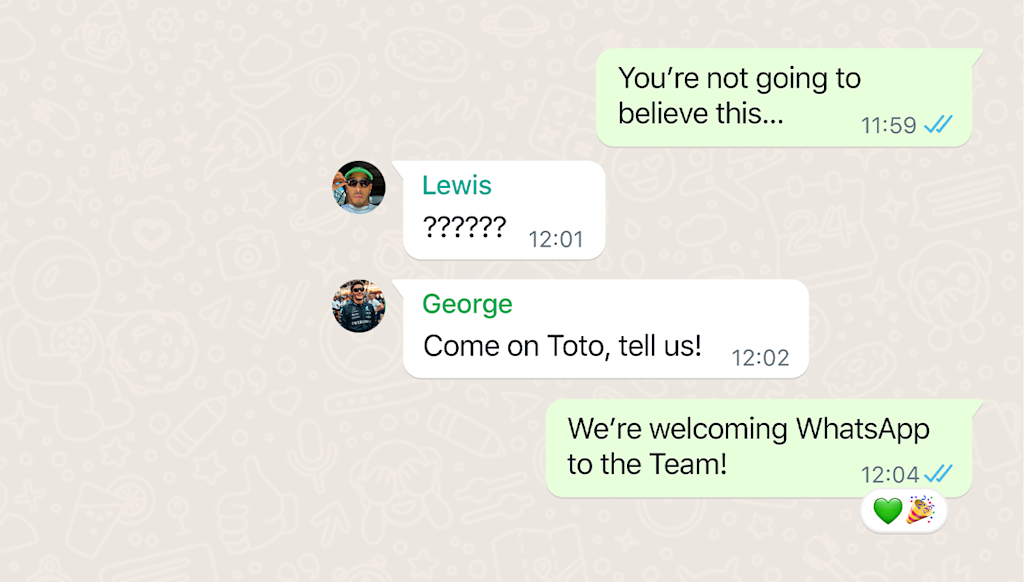 WhatsApp is the world leading private messaging service that connects over two billion people globally. Mercedes-AMG F1 relies on WhatsApp as the go to messaging app to collaborate, champion one another, and maintain crucial real-time coordination during 23 races a year on multiple continents. For years, WhatsApp chats have been part of the culture of success of the Mercedes-AMG F1 team that enables fast and efficient decision making on and off the track.